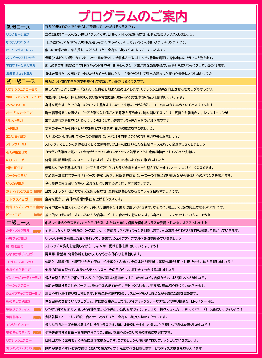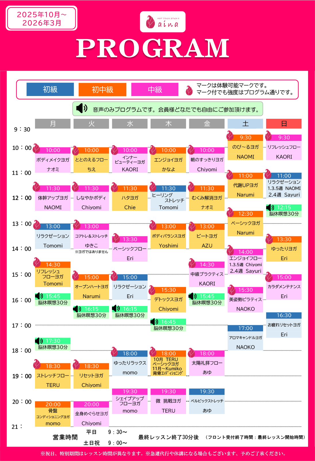 2025年10月~2026年3月レッスンプログラム 2025.09.30 2025年10月~2026年3月のレッスンプログラムです。 レッスンのご予約はこちら レッスンプログラムページはこちら 2025年10月~2026年3月レッスンプログラム お盆期間 営業のご案内 前の記事