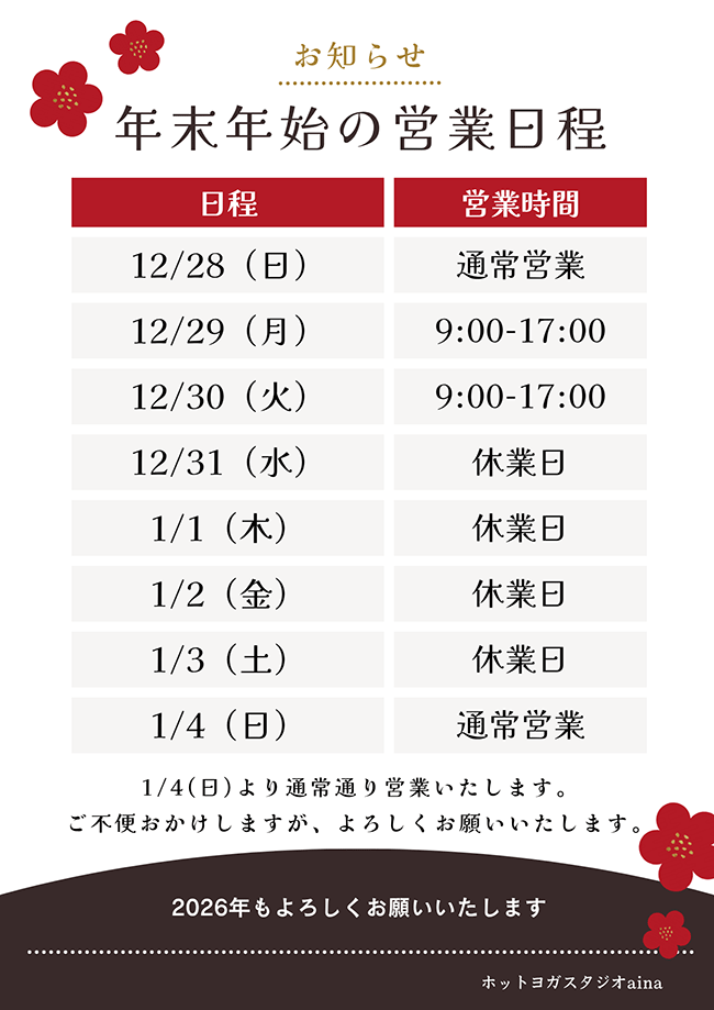 2026年もホットヨガスタジオainaをよろしくお願いいたします。